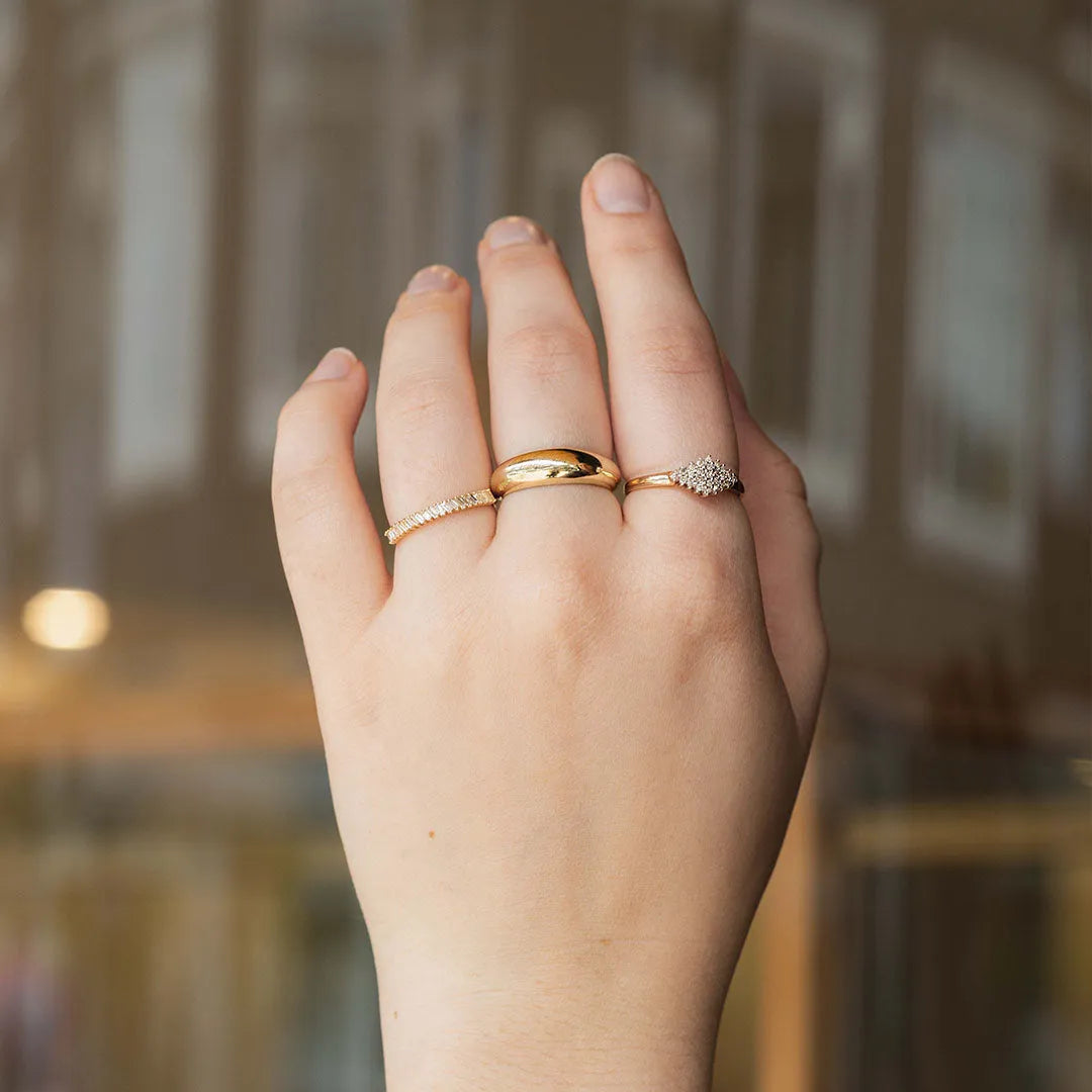The modern Dome ring is easy to combine with other rings and is a real addition to your jewelry collection thanks to its comfortable wearability. This ring adds a luxurious touch to any jewelry look and is perfect as a durable heirloom.