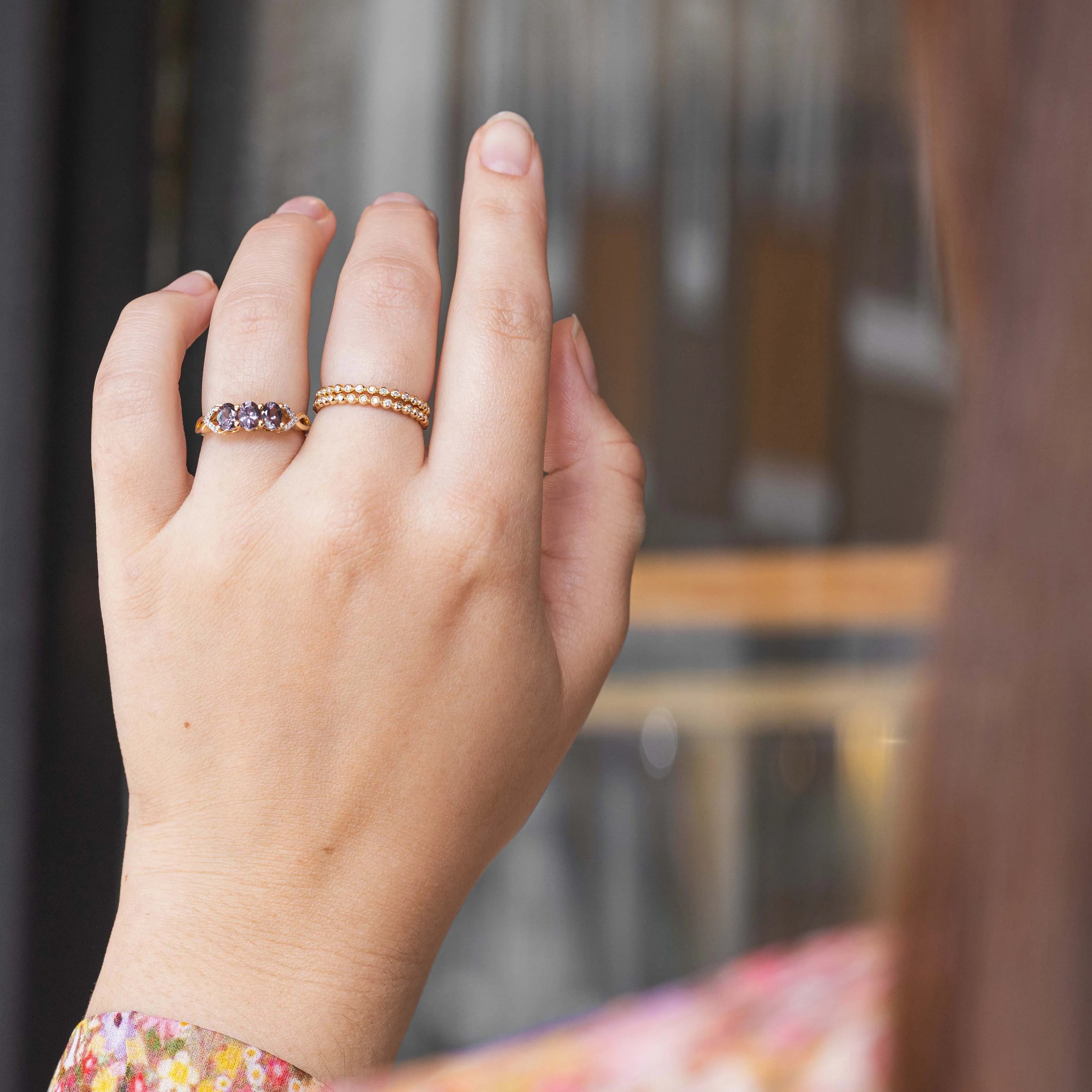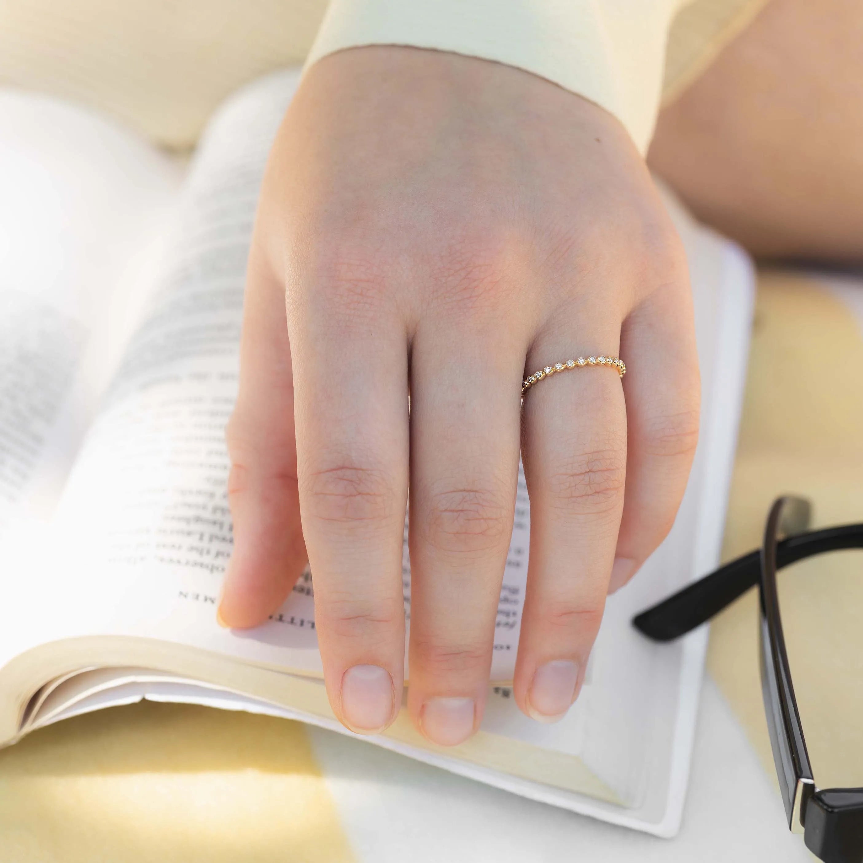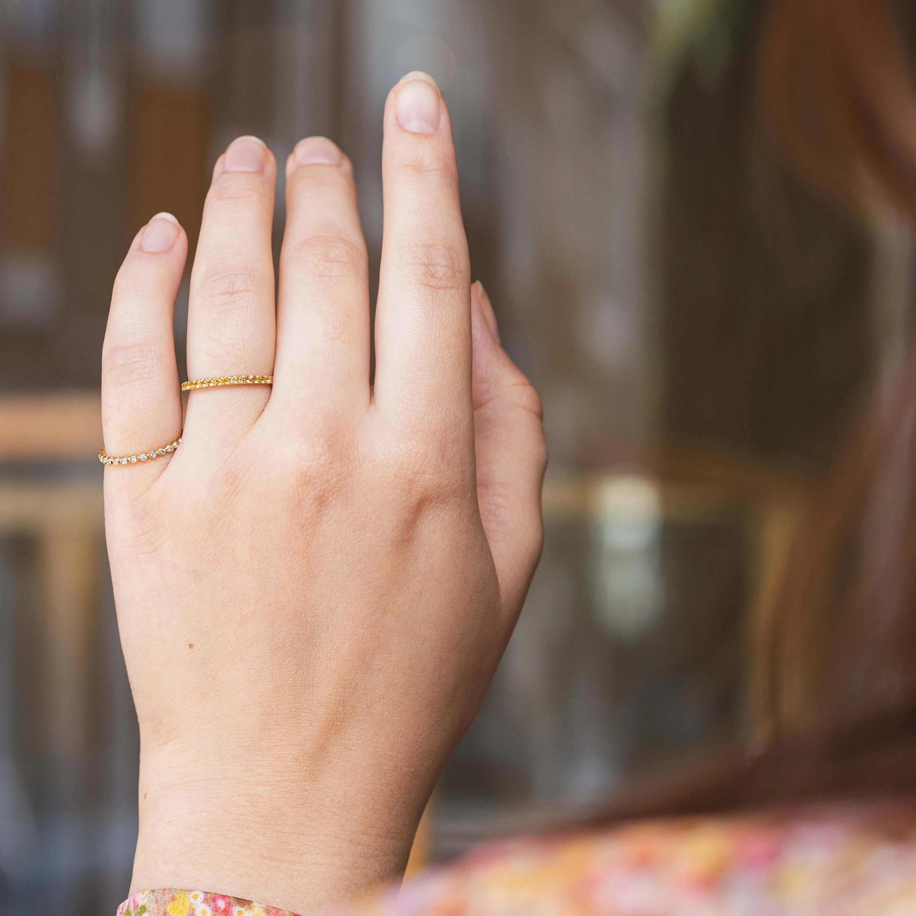 The Bubble Diamond Eternity Ring is the perfect stacking ring for anyone who loves a playful look. The full eternity ring creates a luxurious look, and the Bubble Diamond ring can be worn on any finger to add a sparkling touch to your ring stack. The Bubble ring is also perfect as a pinky ring.