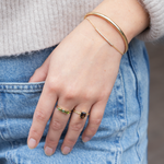 The Sally Ring with green tourmaline is a must-have for fall, with a bold touch thanks to its transverse setting. Pair the Sally Ring with the Siena Square ring for a complete look, or finish it off with an ear stack full of tourmaline!