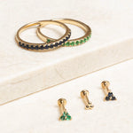 Emerald is so special it even has its own color name: Emerald Green. This luxurious gemstone is set in a modern, timeless trilogy piercing stud. Combine it with sapphire, citrine, or diamond for an irresistible look. Emerald is one of the birthstones of May.