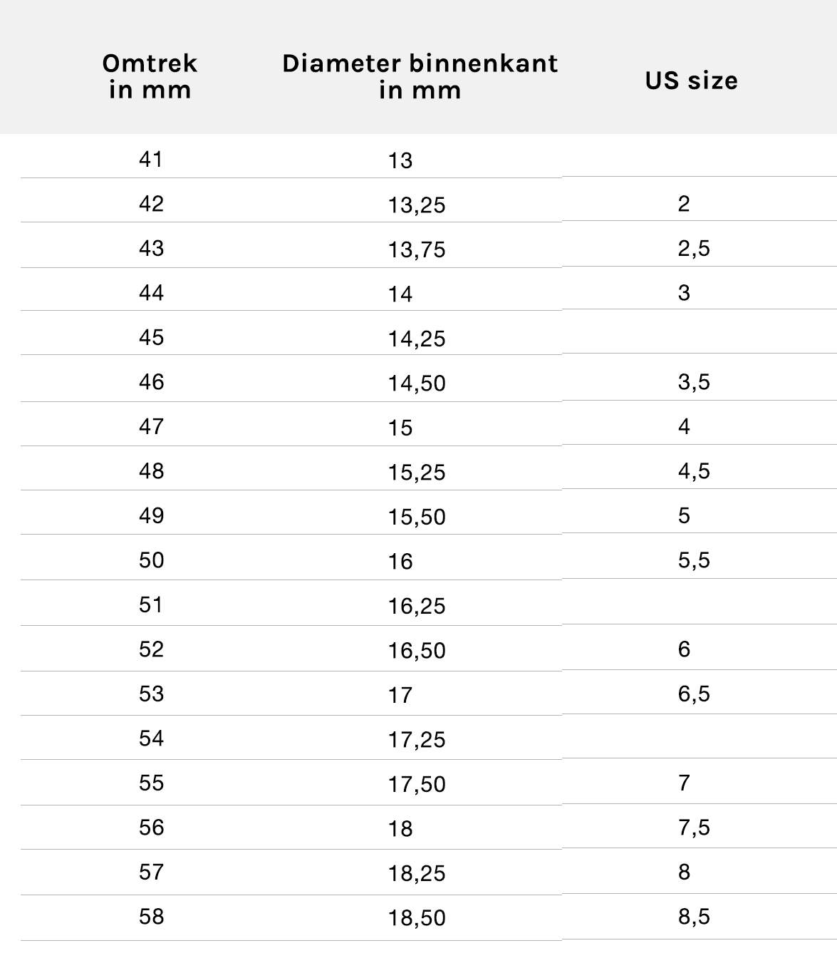 - Gebruik bovenstaande tabel om de ringmaat (diameter binnenkant in mm) te bepalen